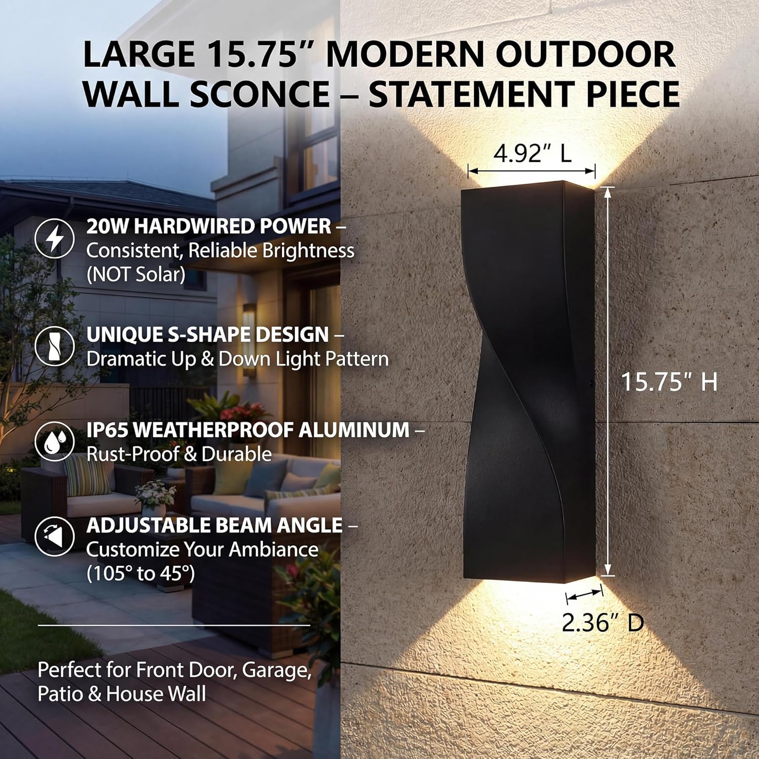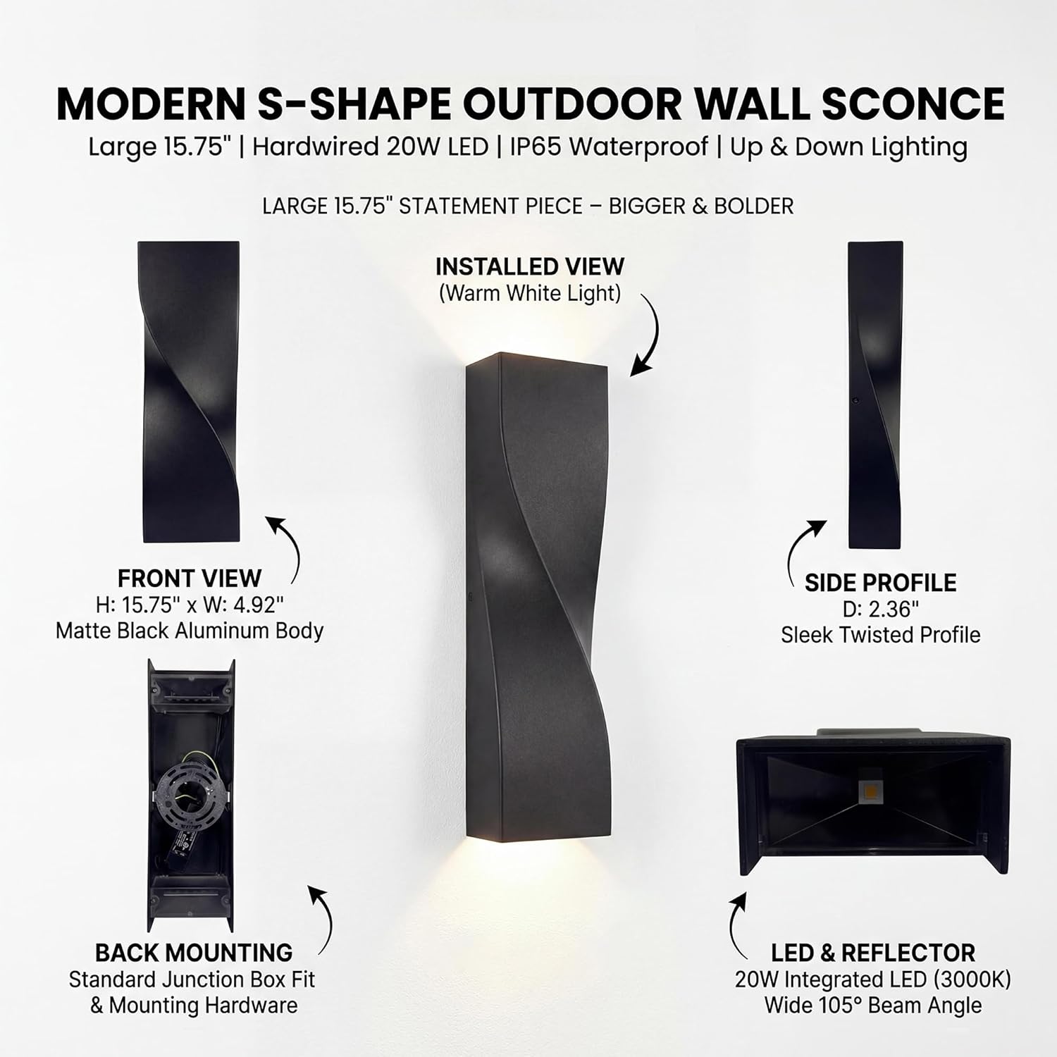 + Free Shipping- LARGE 15.75″ STATEMENT PIECE – BIGGER & BOLDER: Unlike standard 10-inch sconces, our 15.75-inch vertical S-shape fixture provides a grand architectural scale. A modern art sculpture that elevates your front porch, garage columns, or patio.