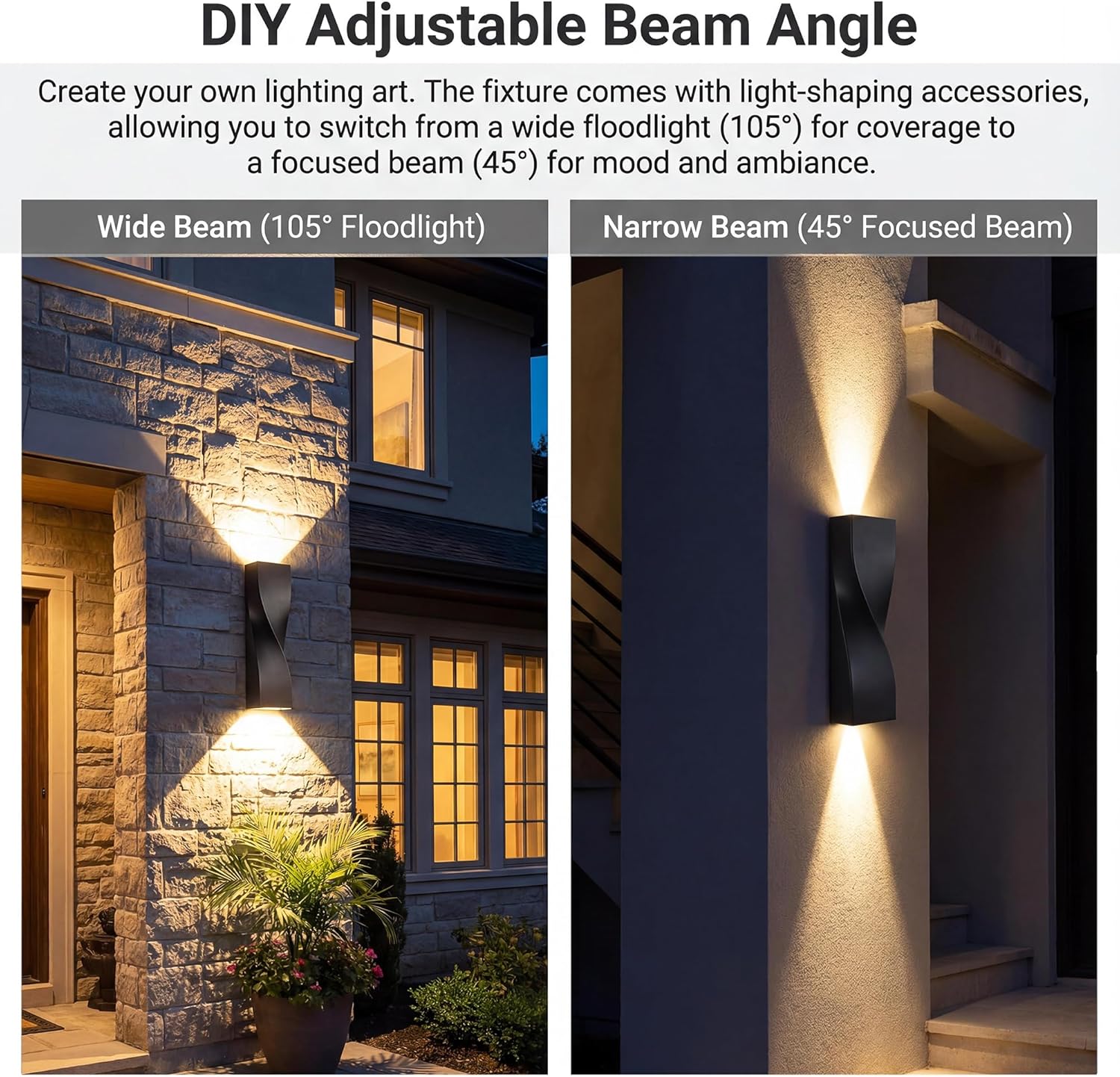 The adjustable beam angle is what sold me. I use it at a wider angle to wash my entire front wall with light. The hourglass shadow effect at night is really striking. Build quality is excellent – solid aluminum, heavy. This does not feel cheap at all.